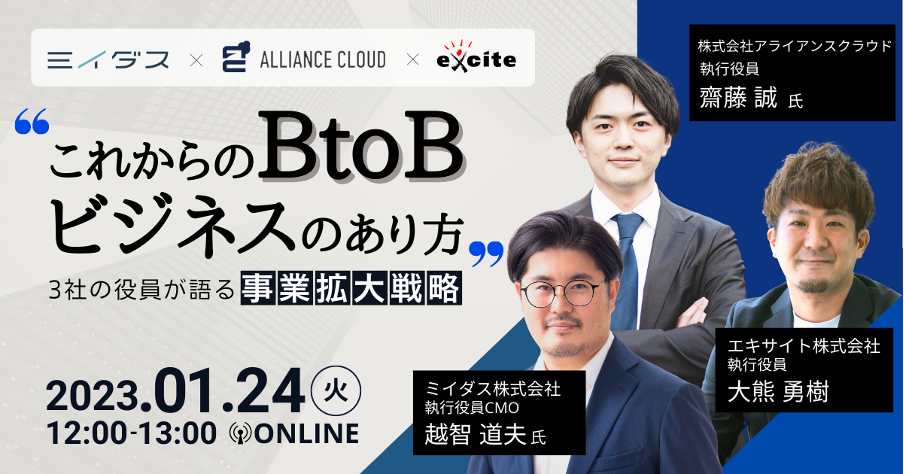 今回はこれからのBtoBビジネスの在り方をテーマに、アセスメントリクルーティングプラットフォームの「ミイダス」を運営するミイダス株式会社よりCMOの越智様を、決裁者マッチングプラットホーム「アポレル」を運用する株式会社アライアンスクラウドより執行役員の齋藤様をお呼びし、各社の事業拡大のための経営戦略についてお話しいただきます。
