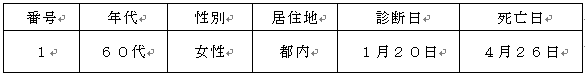 新型コロナウイルスに関連した患者の死亡について business Twitter Facebook はてブ Pocket LINE コピー 2022.06.22 この記事は約1分で読めます。 都内で新型コロナウイルスに感染した方が死亡されましたのでお知らせします。 お亡くなりになった方のご冥福をお祈り申し上げます。 ※ 患者・御家族の人権尊重・個人情報保護に御理解と御配慮をお願いします。