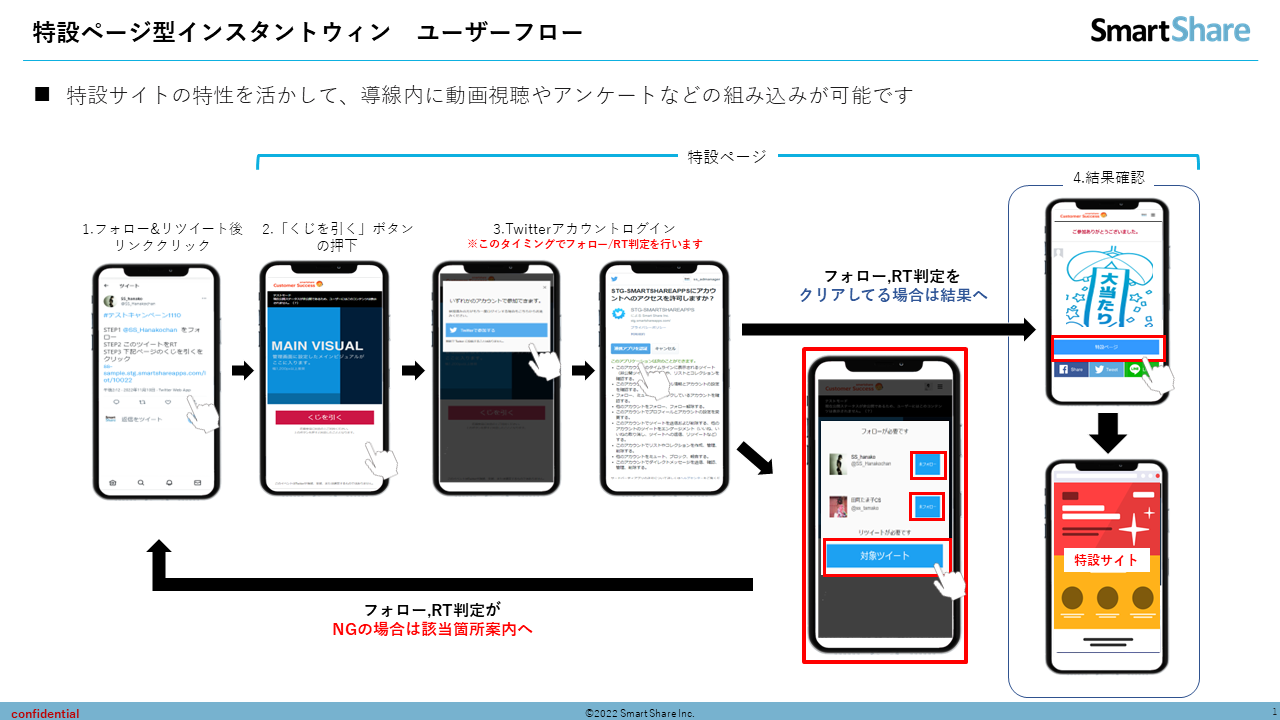 ⇒ OWNLYの特設サイト型インスタントウィンを活用することで、「該当ツイートのRT」および「対象アカウントのWフォロー」の実施判定が可能になります。これを行うことでTwitterユーザーの皆様に期待する行動を必ず実施して頂くことが出来ます。