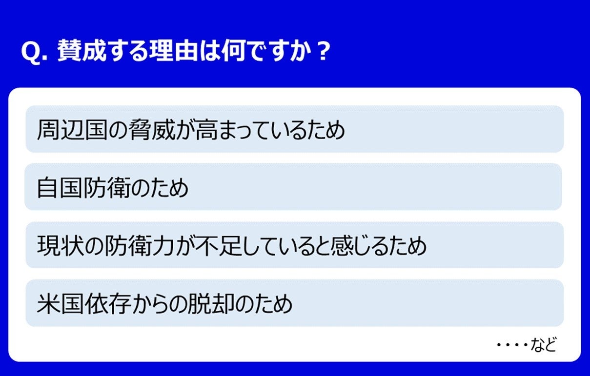 賛成意見では「周辺国の脅威が高まっているため」や「現状の防衛力が不足していると感じるため」など、周辺国の脅威が高まっている背景を踏まえ、自国防衛力を高める観点からの賛成意見が見られる結果になった。