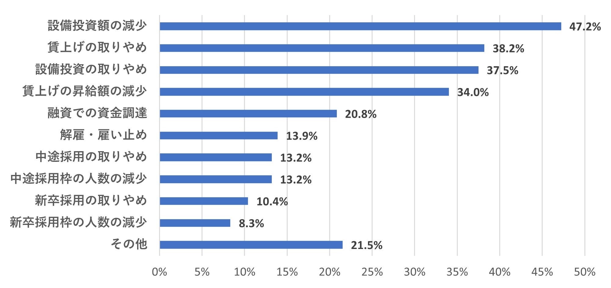 また、具体的な対策の内容としては「設備投資額の減少」が最多の47.2%、次点では「賃上げの取りやめ」が38.2%で続く結果になった。