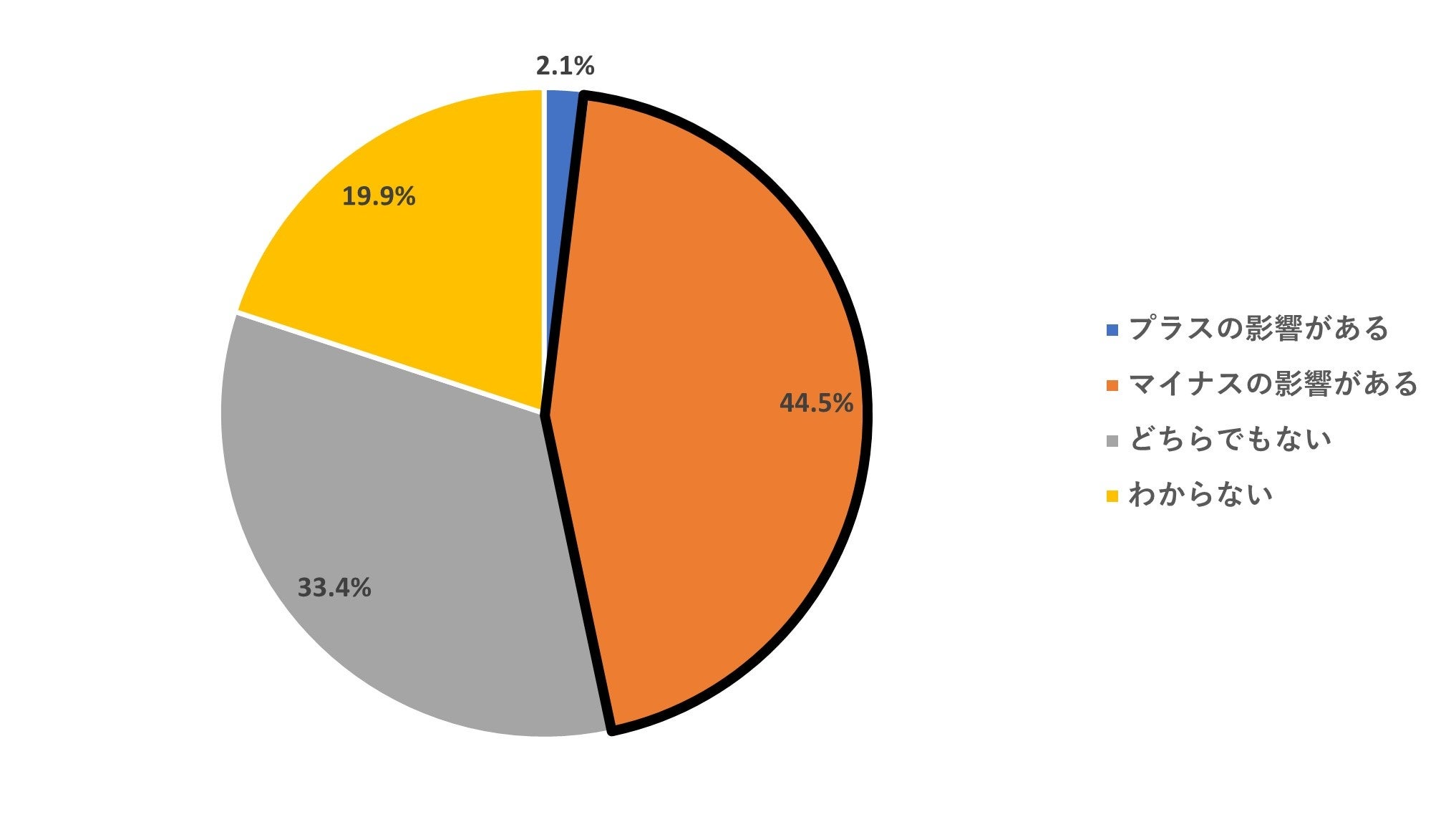 防衛増税による自社のビジネスへの影響ついて聞いたところ、「マイナスの影響がある」が約半数の44.5%という結果になった。その他、「プラスの影響がある」が2.1%、「どちらでもない」が33.4%、「わからない」が19.9%という結果になった。