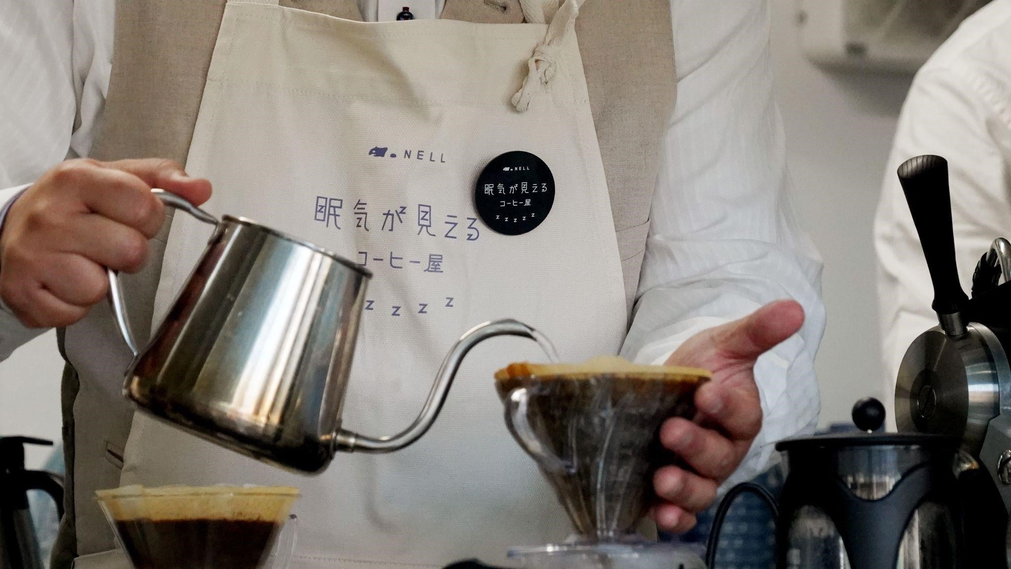 会場では、簡単な設問をもとにお客さまの眠気を測定し、結果に応じて異なるカフェイン量のコーヒーを無料で提供。会場内に設置した「NELLマットレス」に腰掛けてコーヒーをお楽しみいただきました。