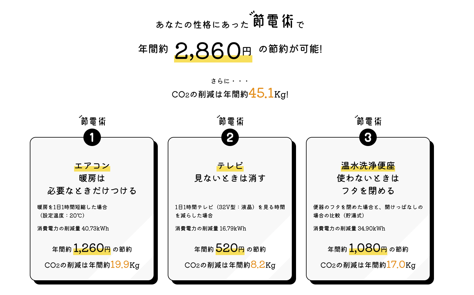 例)ストイックで感情豊かなエリートタイプの場合は、エアコンの暖房は必要なときだけつける、テレビはみないときは消す、温水洗浄便座を使わないときはフタを閉める、といった性格にあった節約術を実践することで年間約2,860円、CO2を年間約45.1Kg削減。