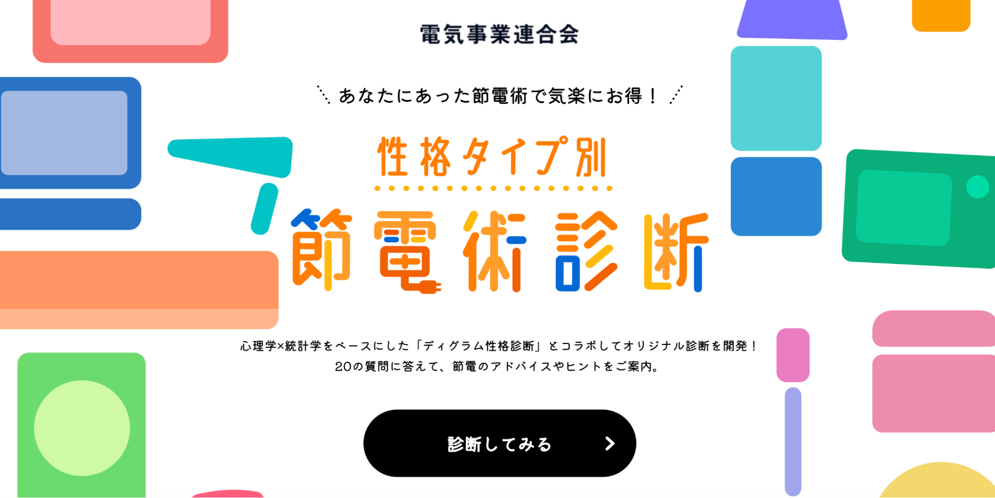 本コンテンツは、簡単な20の質問に答えることで31種類の性格タイプを判定。性格タイプごとにオススメの節電方法をご紹介します。