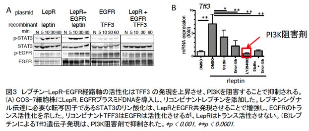 本研究で,食餌性肥満モデルマウスを用い,胃と大腸の病態の違いを比較しました。高脂肪食摂取により胃・大腸共にレプチンの産生が同レベルに認められました。しかし,胃では高脂肪食摂取後早期から,胃酸産生細胞の消失はじめ腸粘膜の形質を持つ腸上皮化生を示しました。一方,大腸では形態変化がほとんど見られず,かなり遅れて浸潤細胞の集積や上皮細胞の核で偽重層化*2が認められました(図2A)。消化管粘膜はムチンやそれに結合するペプチドで表面を覆われています。高脂肪食摂取により,正常な胃では発現しない腸型のムチンであるMuc2やペプチドであるトレフォイルファクター(TFF3)が,胃に異所性に顕著に増加しました(図2B)。別の研究グループから,TFF3は上皮成長因子受容体 (EGFR)の活性化を制御することが報告されています。高脂肪食摂取の胃では大腸よりEGFRの活性化が強いことが示されました。消化管上皮細胞特異的にLepRを欠損させた(T3b-LepR conditional knockout)マウスでは,胃の前がん症状はほぼ完全に抑制され,大腸でも浸潤細胞の集積が減弱しました(図2C)。また,レプチンシグナルでどの経路がTFF3発現に重要なのか,培養細胞を用い調べました。その結果,レプチンはLepRの活性化だけでなくEGFRをトランス活性化し(図3A),TFF3の発現にはPI3K-Akt経路が重要であることがわかりました(図3B)。
