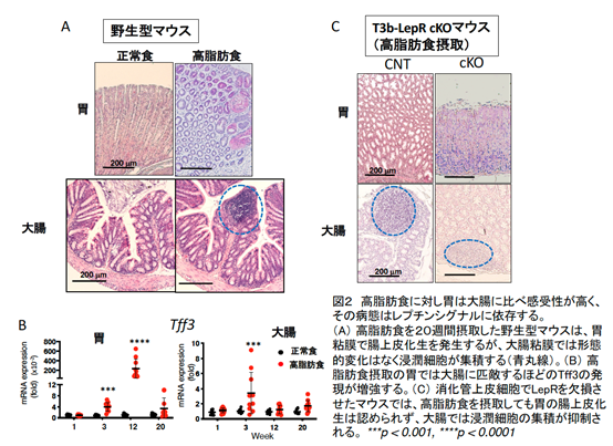 論文タイトル:Augmented leptin-induced trefoil factor 3 expression and epidermal growth factor receptor transactivation differentially influences neoplasia progression in the stomach and colorectum of dietary fat-induced obese mice. (レプチン誘導性トレフォイルファクター3発現と上皮成長因子受容体のトランス活性化は,高脂肪食マウスの胃と大腸において異なる作用で新生物化を促進させる)