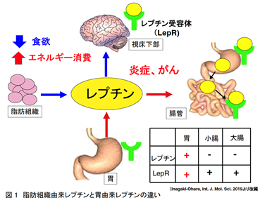 レプチンは脂肪細胞から産生され視床下部に発現する受容体に結合し,食欲抑制やエネルギー代謝亢進を促すホルモンとして広く知られています。一方,レプチンは胃からも恒常的に産生され,管腔を伝って腸管に到達し,ペプチドや糖の吸収に重要な働きを示しますが,生理的意義の多くは不明です(図1)。また腸管は通常レプチンはほとんど産生しませんが,受容体は発現しています。稲垣教授はこれまでに,高脂肪食を正常マウスに摂取させると,胃レプチンの産生及びレプチンシグナルが摂取後早期から亢進することにより,腸上皮化生になることを報告しました(1〜3)。しかし,胃と大腸粘膜の高脂肪食に対する応答性及びその結果起こる病態発症機序はわかりませんでした。