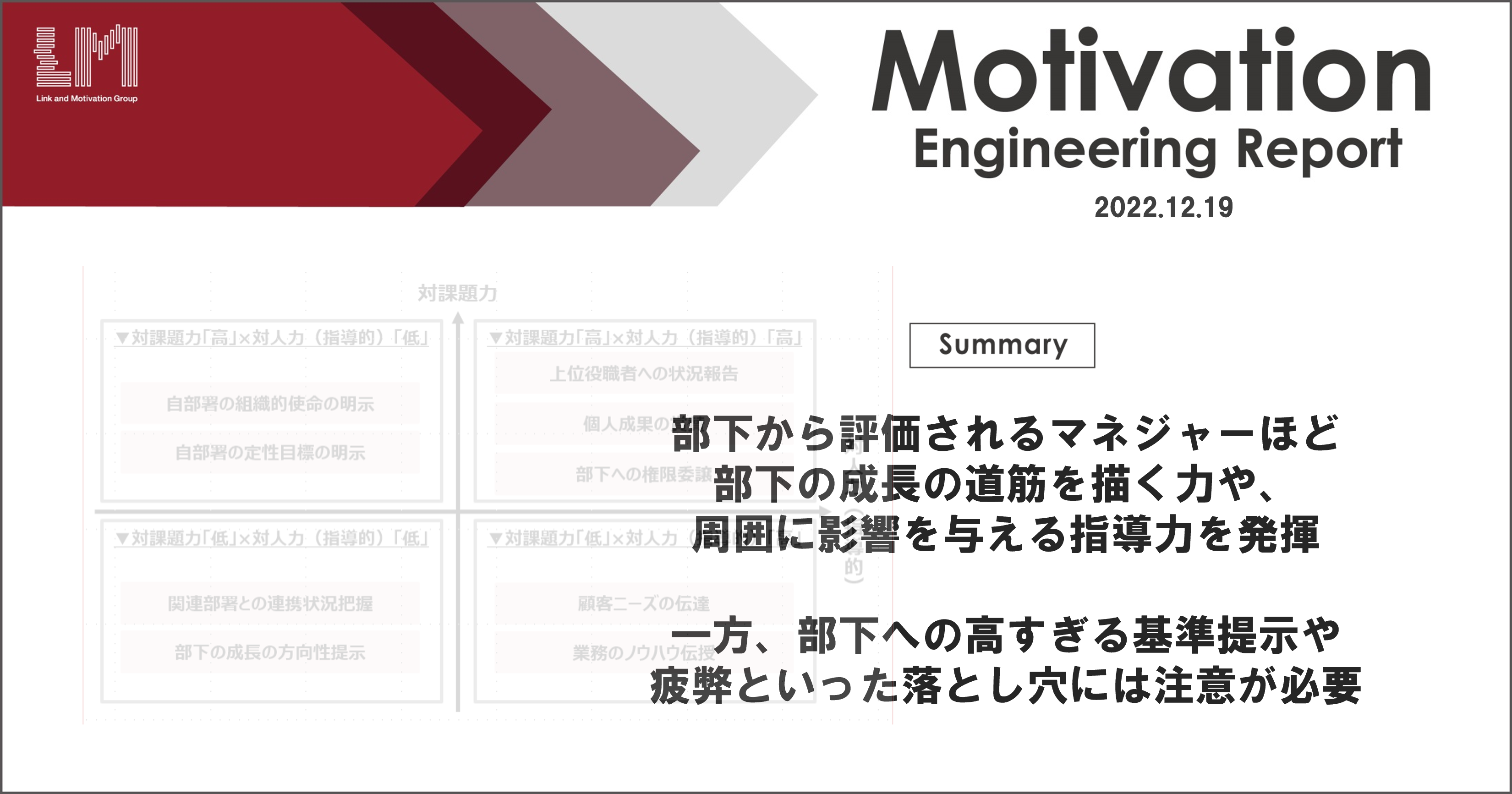 結果、部下から評価されるマネジャーは、部下を単に受容し自主性に任せるのではなく、目標達成や部下の成長の道筋を描き導く力や、周囲に影響を与える指導力を発揮していることが明らかになりました。一方、マジメント力が高いが故に、上司や部下に頼らずに自身で仕事を完遂しようとしたり、部下に求める基準が高く、個々人の頑張りや成果を賞賛できていなかったりする可能性があることが示唆されました。