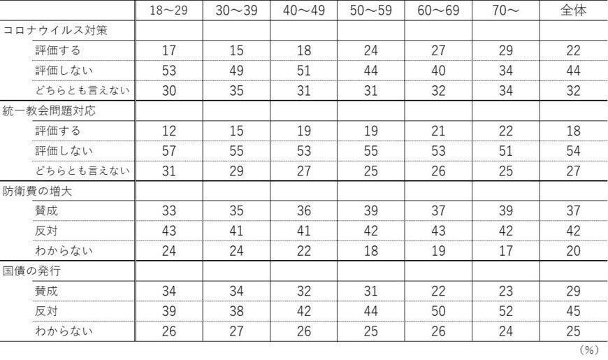 今度は、【表2】をご覧ください。【表1】で取り上げた四つの課題について、年齢別の評価をまとめました。コロナウィルス対策における「評価しない」の比率に「若高-老低」傾向が見受けられるものの、他の課題、すなわち、防衛費の増大や国債の発行などに関しては、全体における賛否の対立比率が各年代でも同じように存在することが確認できるでしょう。社会全体における意見対立と、賛成派、反対派、それぞれの内なる年齢を越えた共有認識、いささか気にかかる構図のようにも思えますが、解釈のしすぎかもしれません。