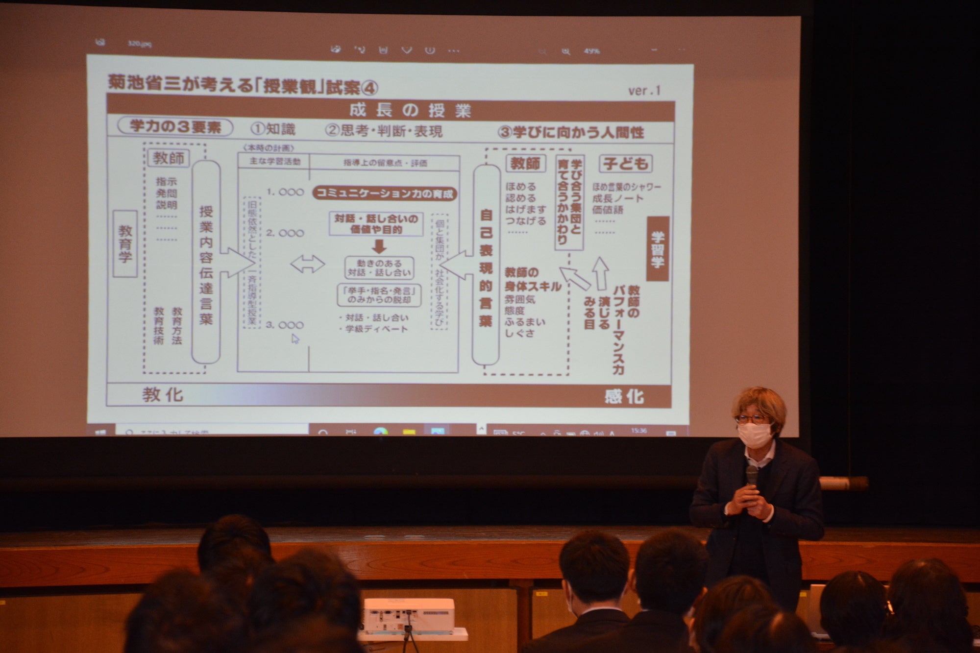 続いて、教員向けに開かれた講演会では、「一人も見捨てない! 菊池学級12か月の言葉かけ」をテーマに教育観を語りました。