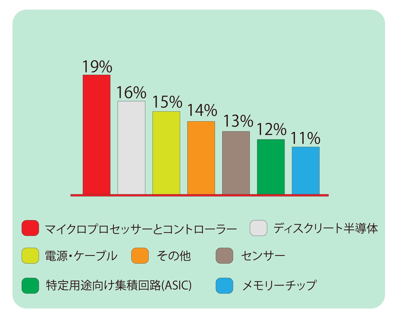 コンポーネントによって、マイクロプロセッサとコントローラ、センサー、特定用途向け集積回路 (ASIC)、メモリ チップ、電源とケーブル、ディスクリート半導体などに分類されます。