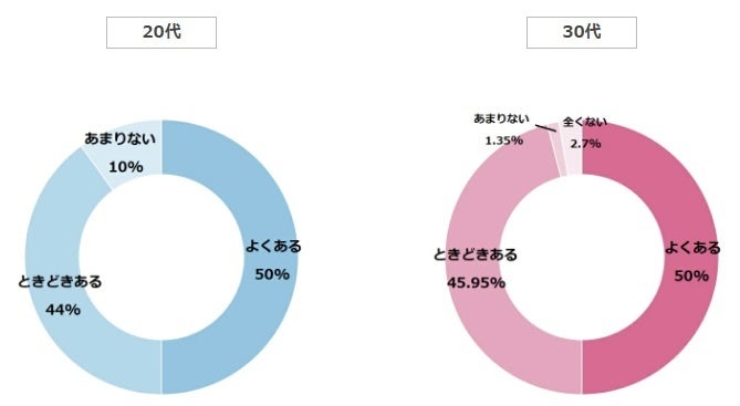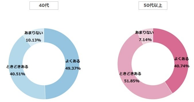 年代別に見てみると、20代・30代・40代は「よくある」がほぼ同率で50%程度、「ときどきある」が40~45%。 50代以上の人だと「よくある」「ときどきある」の割合が他年代とは逆転していますが、どの年代も9割以上の人が目の疲れを感じていることがわかります。
