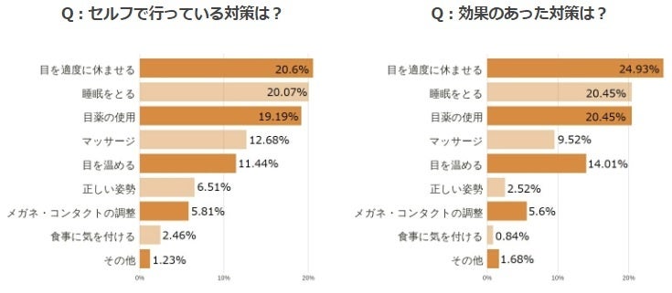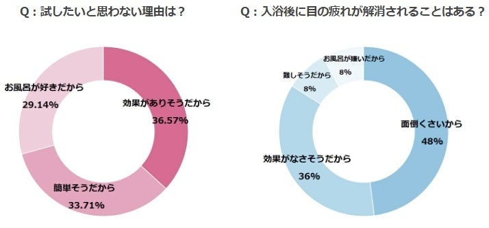 セルフの対策としては、トップから目を適度に休ませる・睡眠をとる・目薬の使用ということで、日常生活の中で手軽にできることを多く実践していると言えます。 効果のあった対策としても、若干の順位変動はありますがほぼほぼ同様の順位・割合となりました。 これらの対策は、皆さん当然のことのように行っていることかもしれませんが、これにプラスして、お風呂に入ることで目の疲れを癒す方法があります。