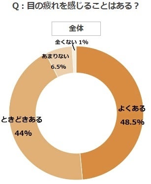 また、年代を区切らず“仕事で目をよく使う人”の結果を見ると、こちらも9割以上の人“が疲れを感じることがある”との回答ですが、全体と比較した際に、“ある”と回答した人トータル割合としてはほぼほぼ同じ数値となっています。