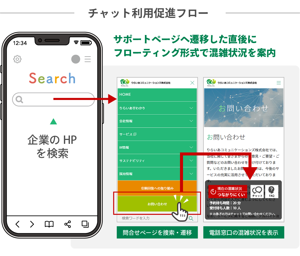 チャットの利用率が伸びない原因に、顧客がその存在に気付いていない、チャットの利便性を認識されていないことがあります。当サービスは、企業へ問い合わせを行う顧客の行動と心理に基づき、顧客が企業のホームページ上で問い合わせ先を検索する際、電話受付の混雑状況をリアルに表示し、チャットへの誘導を促すものです。
