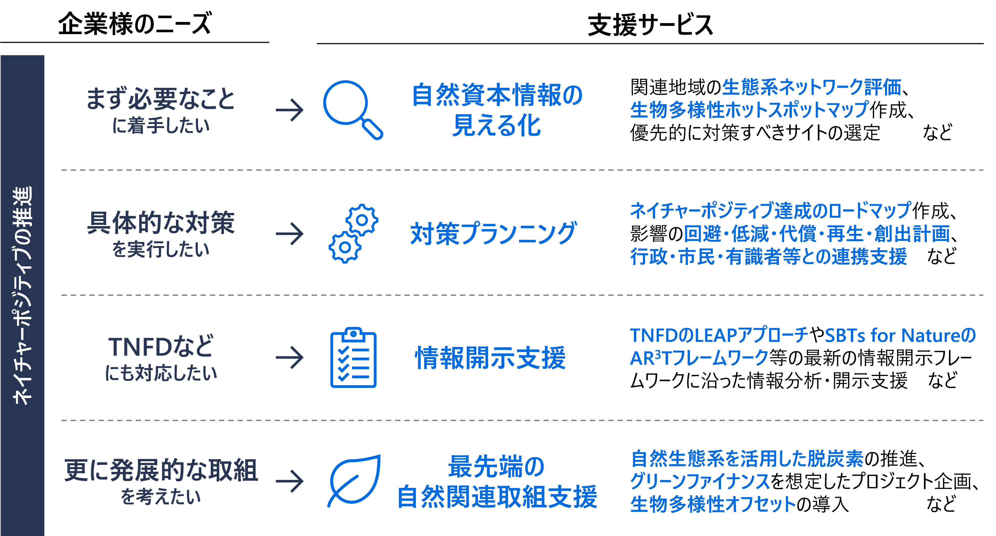我々は地域に根ざした生物多様性や自然資本の専門家として、本サービスを通じて企業の皆様と課題解決に取り組み、ネイチャーポジティブ達成に貢献していきます。