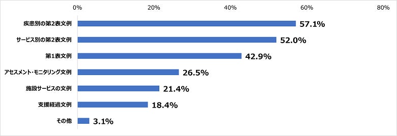 「疾患別の第2表文例(57.1%)」、「サービス別の第2表文例(52.0%)」、「第1表文例(42.9%)」が上位となりました。