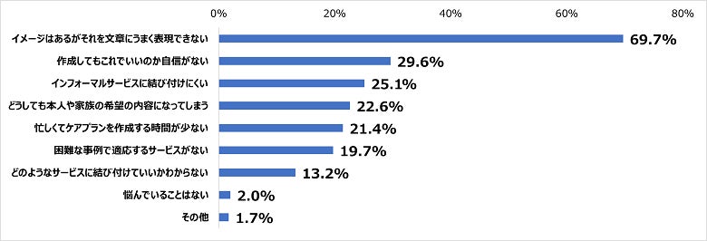 「イメージはあるがそれを文章にうまく表現できない(69.7%)」が圧倒的に多く、「作成してもこれでいいのか自信がない(29.6%)」、「インフォーマルサービスに結び付けにくい(25.1%)」、「どうしても本人や家族の希望の内容になってしまう(22.6%)」、「忙しくてケアプランを作成する時間が少ない(21.4%)」等の項目が続きました。