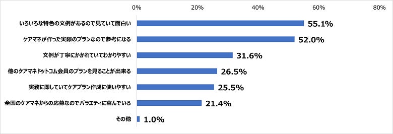 「いろいろな特色の文例があるので見ていて面白い(55.1%)」、「ケアマネが作った実際のプランなので参考になる(52.0%)」、「文例が丁寧にかかれていてわかりやすい(31.6%)」が上位となりました。