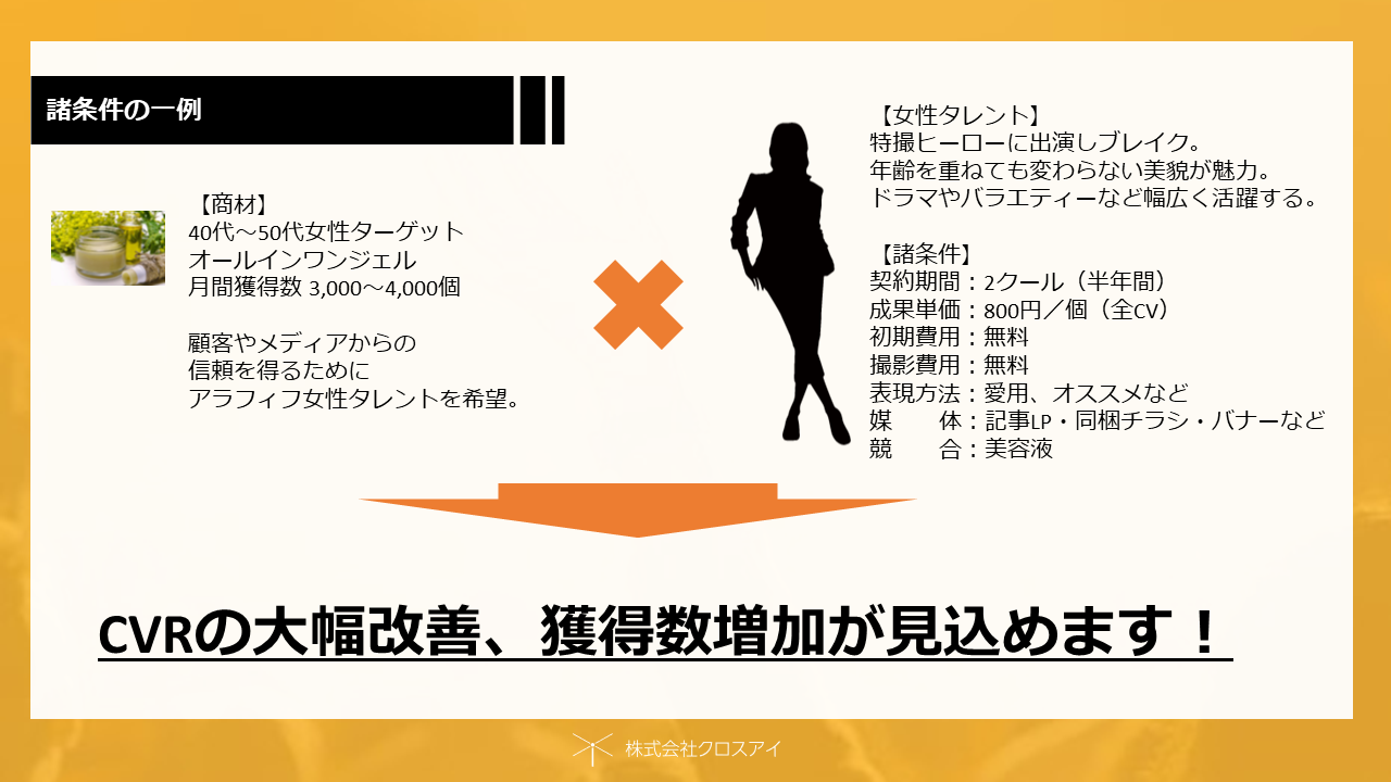また、3,000件のキャスティング提案を誇る株式会社クロスアイがリリースする「アフィキャス」では、D2Cメーカー様一社ごとに、最適なタレント起用プランをご提案します。