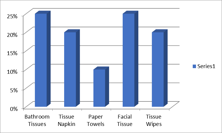 回答: 当社の調査によると、家庭でのフェイシャル ワイプおよびウェット ワイプの使用の増加が、このセグメントの成長を後押しすると予想されることがわかりました。さらに、環境への関心の高まりと持続可能な製品に対する需要の高まりは、業界の主要な一般的な傾向の 1 つです。家にいる(AH) (20%)、家から離れている(AFH) (30%)、親のロール (25%)