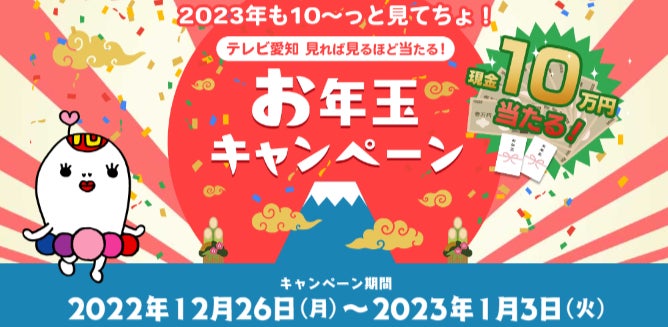 テレビ愛知では、現金10万円ほか豪華賞品が当たる「2023年も10(じゅう)~っと見てちょ!お年玉キャンペーン」を実施します。年末年始の対象番組を見れば見るほど、お年玉をゲットできるチャンス!ぜひご参加ください。
