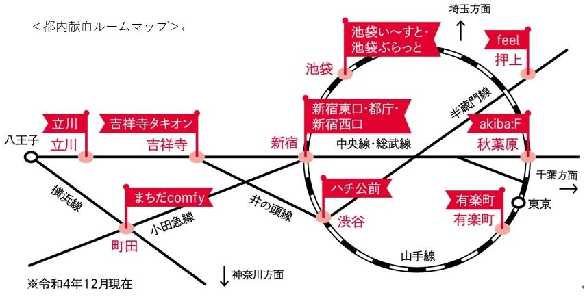 ・都内12か所の常設の献血ルーム(下記マップ参照)、献血バス等で献血できます。