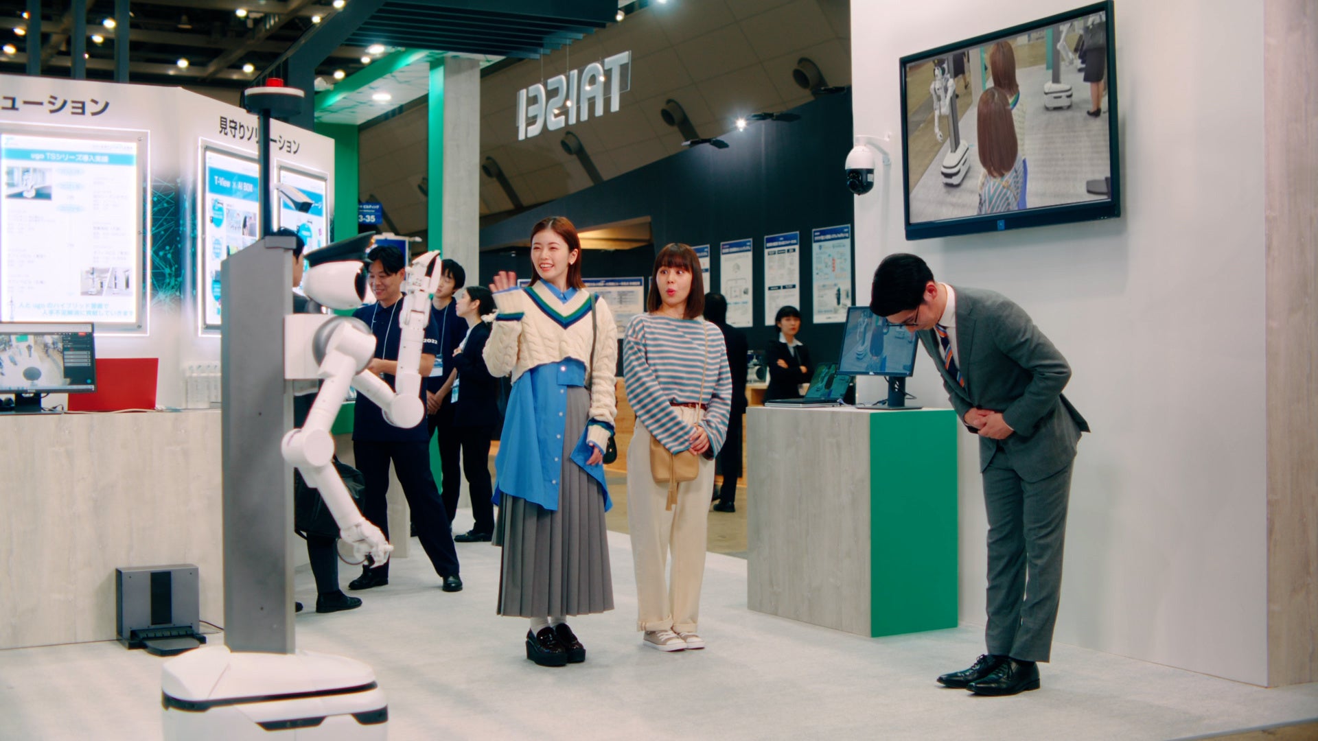 休日、展示会場にやってきた小芝さんと友人。そこで、前回のCMで共演した大成社員・片井一郎に出会います。大成の展示ブースで「T-Spider」についてカタい説明をする片井。そこに、大成の副社長(本人)が登場。驚く小芝さんと友人。