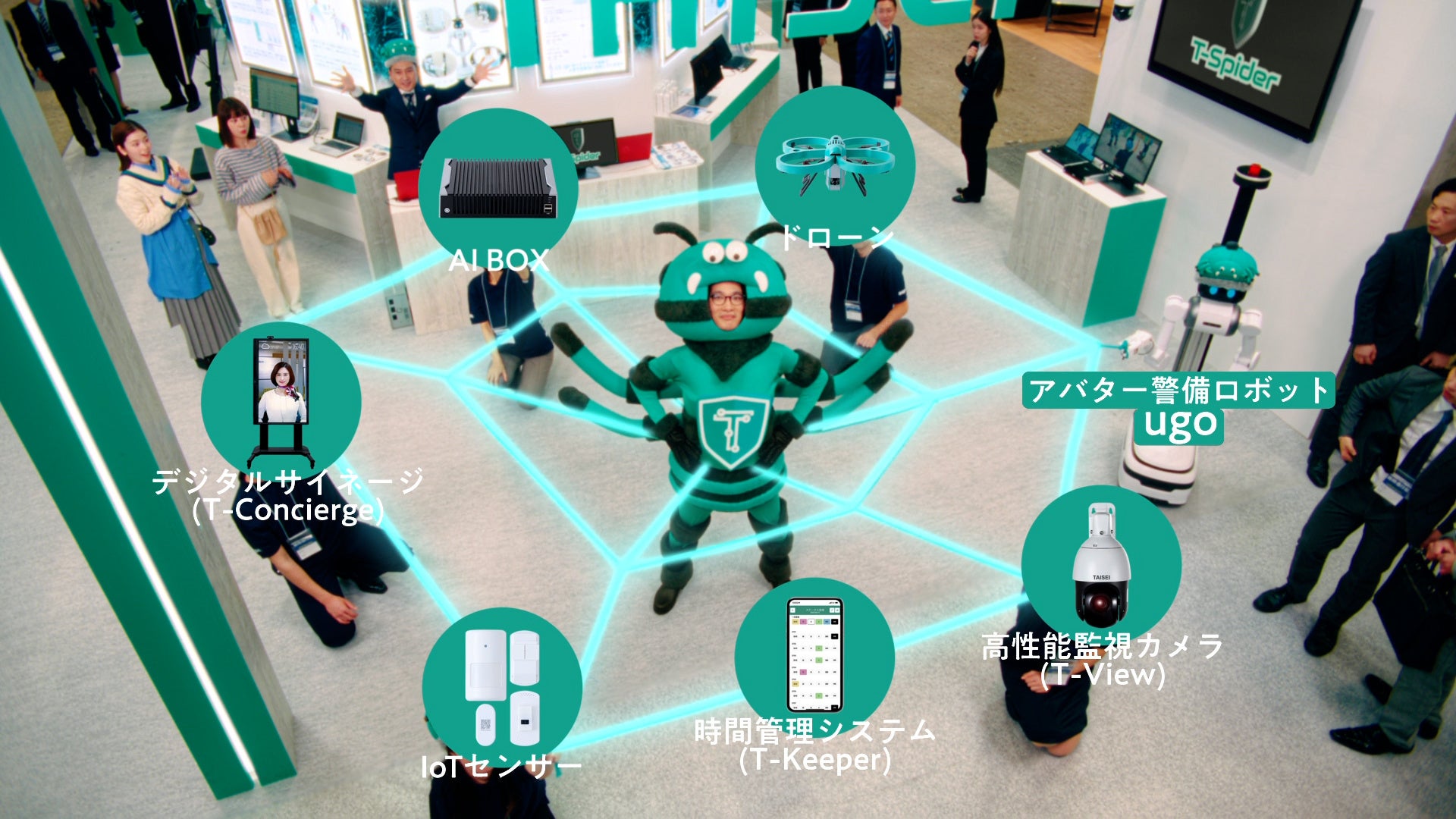 「T-Spider」は、幅広い業務を統合・管理できる情報プラットフォームです。警備ロボット、監視カメラ、デジタルサイネージ、IoT機器を連携し、施設の規模や用途に応じた適切なシステムで、お客様が求めるサービスをワンストップで提供いたします。