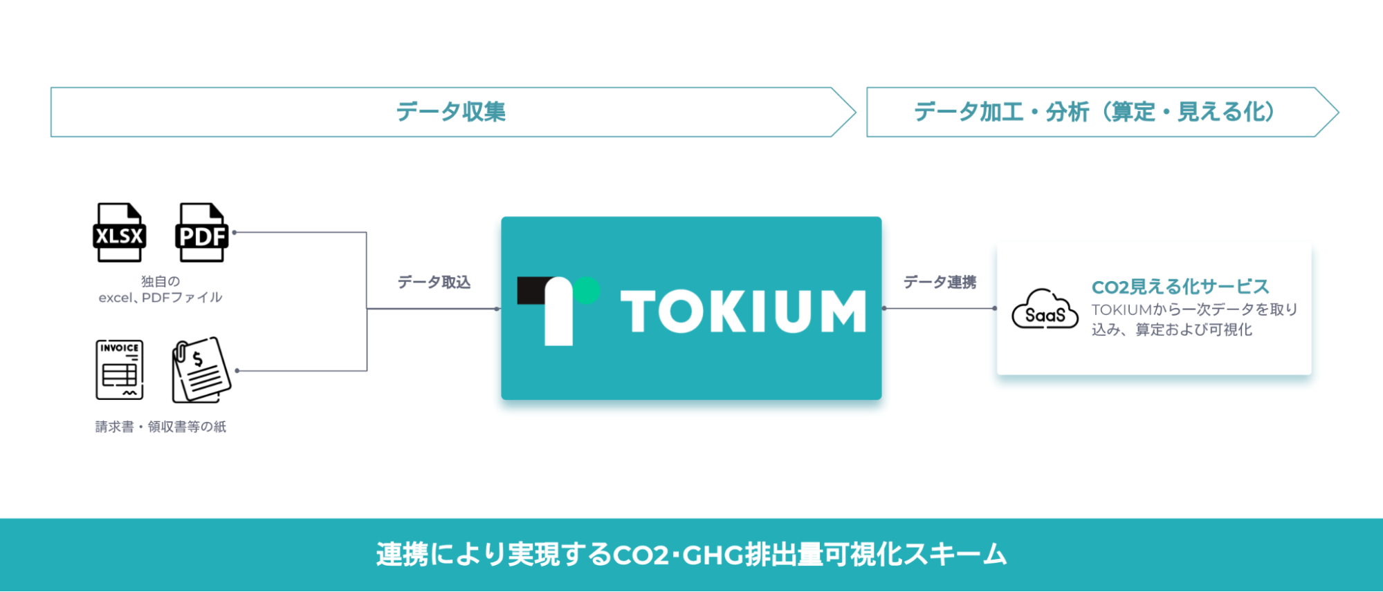 連携により、TOKIUMインボイスによって受領した請求書データを活動量として、CO2排出量見える化ツールに一括インポートが可能となり、これを基に排出量の計算を行います。