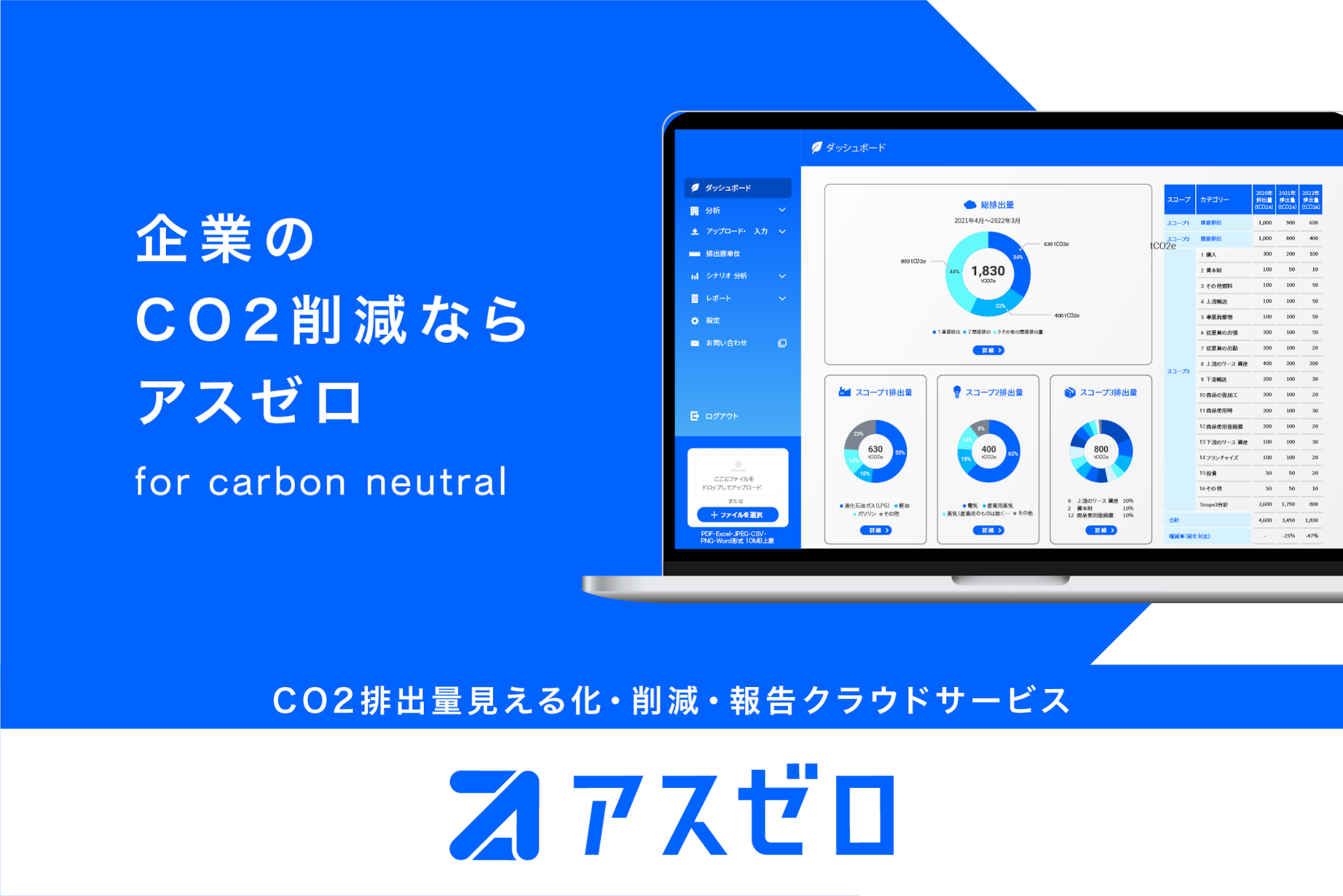 「アスゼロ」は、複雑だったCO2排出量算出業務をカンタンにサポートする、CO2排出量見える化・削減・報告クラウドサービスです。