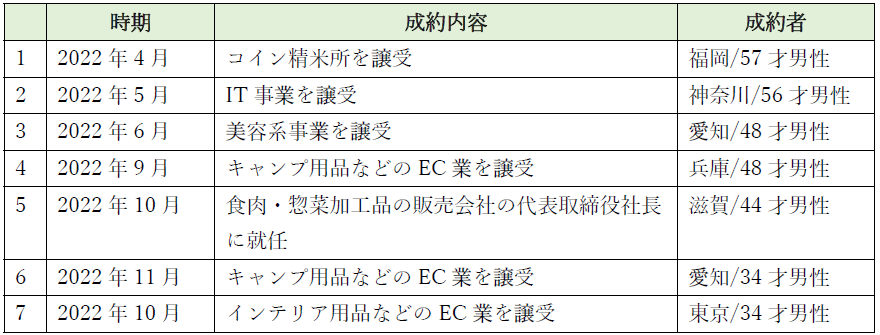 - 個別の案件探索支援、実際の譲渡案件へのエントリー添削、面談サポート