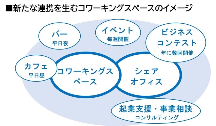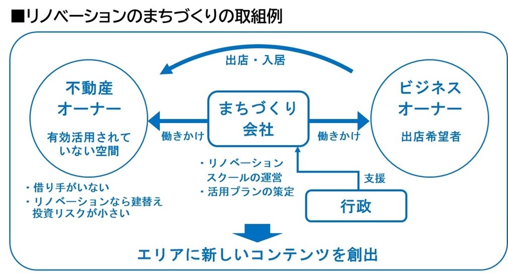 創業・開業にかかるハードルの低減に努め、新しいビジネスに挑戦しやすいまちに進化させる。創業及び集客にシナジーを生むソフト・ハードの仕組みを構築する。