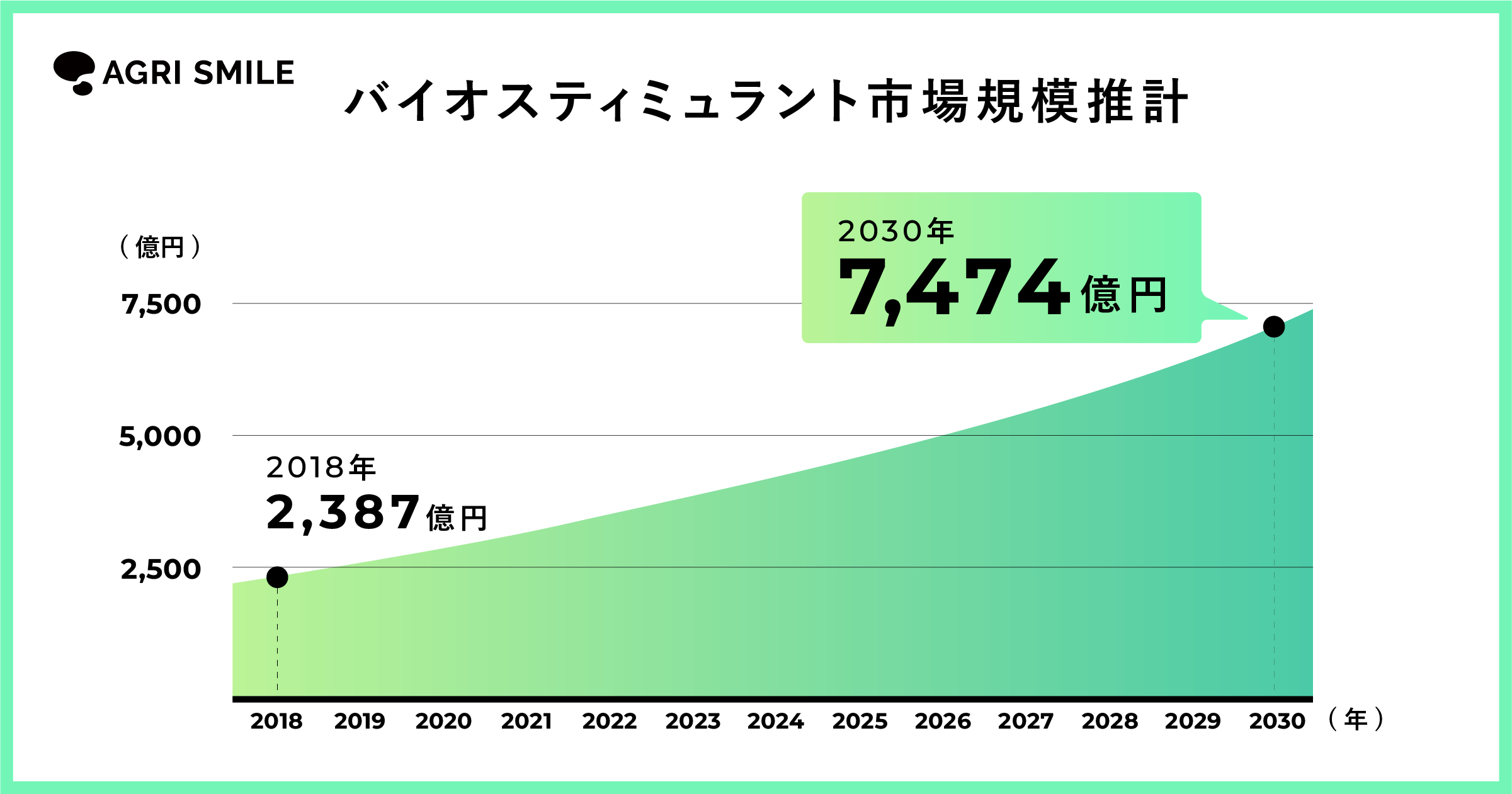 バイオスティミュラントとは、植物の免疫系を活性化する資材として、2030年に約7500億円のマーケットとして注目されている新しい農業資材です。気候変動によるストレス耐性に寄与し、農作物の収量や品質に効果をもたらします。