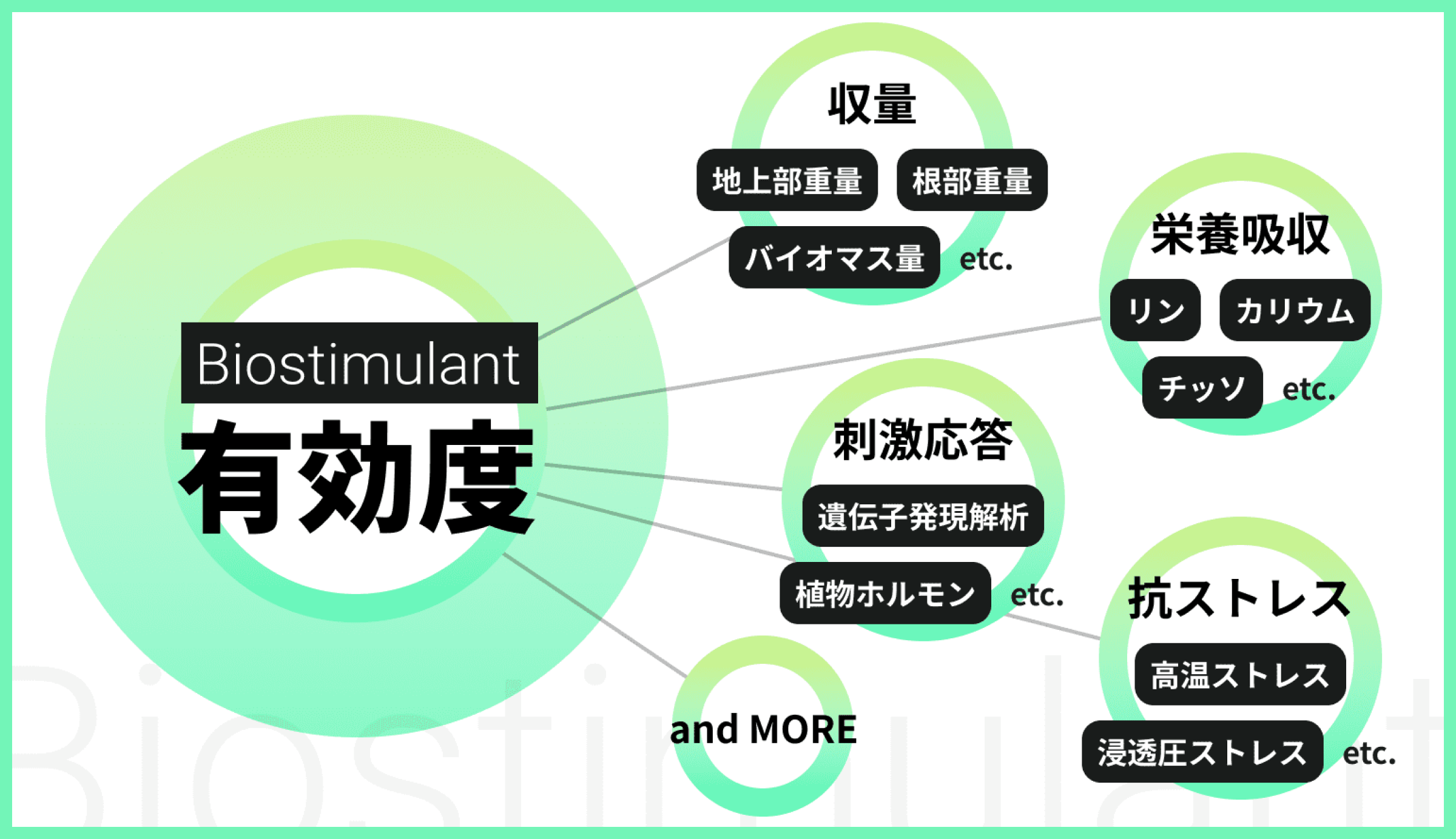 バイオスティミュラントは、「作物の活力・収量・品質および収穫後の保存性を改善する資材」として欧米を中心に利用拡大しており、2030年に約7500億円のマーケットとして注目されている新しい農業資材です。気候変動によるストレス耐性に寄与し、植物の免疫系を活性化することで、根張り・収量の向上や、乾燥/過湿耐性、耐病性、耐⾼/低温性、耐塩性といった効果をもたらします。
