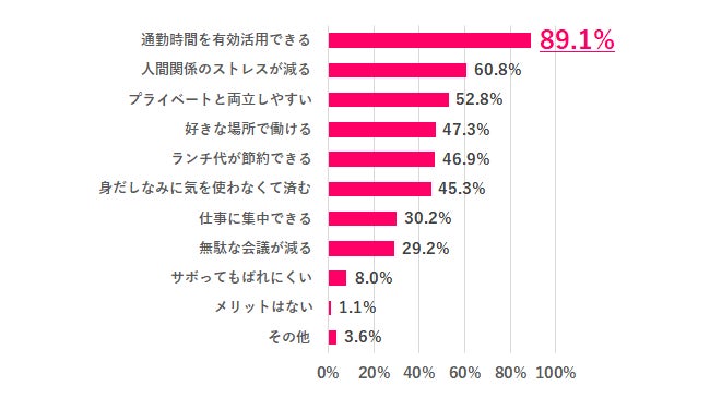 リモートワークのメリットについて尋ねると、1位「通勤時間を有効活用できる」が圧倒的で、次いで「人間関係のストレスが減る」60.8%、「プライベートと両立しやすい」52.8%となっています。「メリットはない」と回答した人は1.1%に過ぎず、その他の意見としては「感染予防になる」「ペーパーレス、残業削減」「夫の転勤について行ける」などがありました。