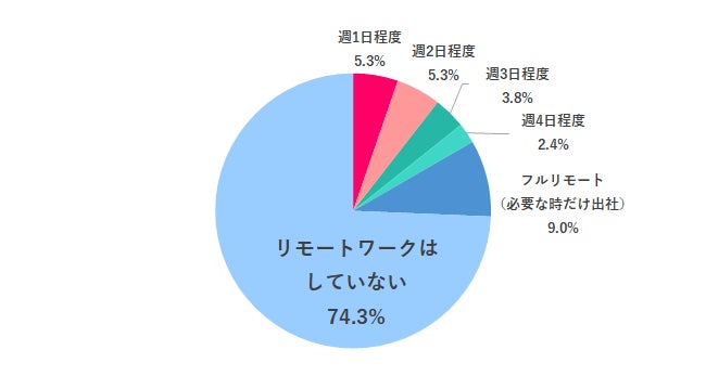 『女の転職type』会員に現在、どの程度リモートワークをしているかを聞いたところ、74.3%の人が「リモートワークはしていない」と回答し、リモートワークをしている人は4人に1人の割合でした。リモートワークをしている人の中で最も多かったのは「フルリモート(必要な時だけ出社)」で9.0%でした。