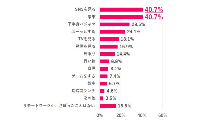 ★リモートワーク中ついさぼってやってしまったことは、「SNSを見る」「家事」に次いで「下半身パジャマ」