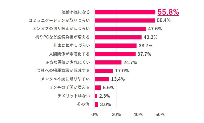 逆に、リモートワークのデメリットについて尋ねると、1位「運動不足になる」、2位「コミュニケーションが取りづらい」55.4%、「オンオフの切り替えがしづらい」47.6%となっています。その他の意見としては「光熱費がかかる」「同居家族から怠けていると誤解される」などがありました。