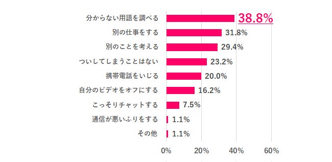 リモート会議中、ついしてしまうことは、1位「分からない用語を調べる」38.8%、2位「別の仕事をする」29.4%、3位「別のことを考える」31.8%となりました。「ついしてしまうことはない」と答えた人は23.2%にとどまり、リモート会議中は何かしらこっそりしていることがある人が多い実態がわかりました。