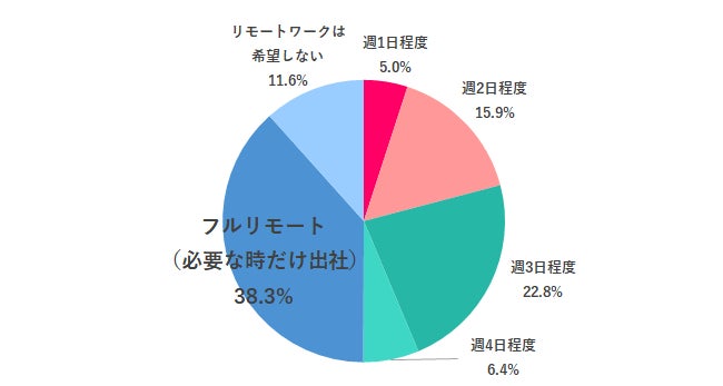 一方、理想的なリモートワークの頻度について尋ねると、1位は「フルリモート(必要な時だけ出社)」38.3%で、現実では9.0%しかいなかったフルリモートがトップです。次いで、2位「週3日程度」22.8%、3位「週2日程度」15.9%となっており、現実ではリモートワークをしてる人は25.7%にとどまるものの、理想では88.4%がリモートワークを希望しており大きなギャップがあります。