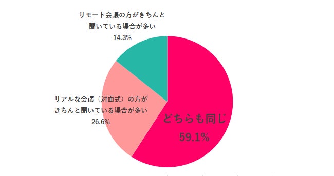 リモート会議とリアルな会議(対面式)の差について尋ねたところ、「どちらも同じ」59.1%が最も多い結果となりましたが、「リアルな会議(対面式)の方がきちんと聞いている場合が多い」と「リモート会議の方がきちんと聞いている場合が多い」を比較すると、前者は26.6%、後者は14.3%となっており、リアルな会議の方がきちんと聞いている場合が多い人の方が、約1.9倍多いことがわかりました。