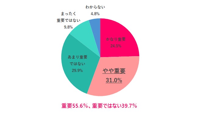 リモートワークができることは転職先(就業先)を決める上でどの程度重要かを尋ねてみると、1位「やや重要」31.0%、2位「あまり重要ではない」29.9%、3位「かなり重要」24.5%となりました。「やや重要」「かなり重要」と考える重要派は55.6%で、「あまり重要ではない」「まったく重要ではない」の重要ではない派の39.7%より15.9%多い結果となりました。