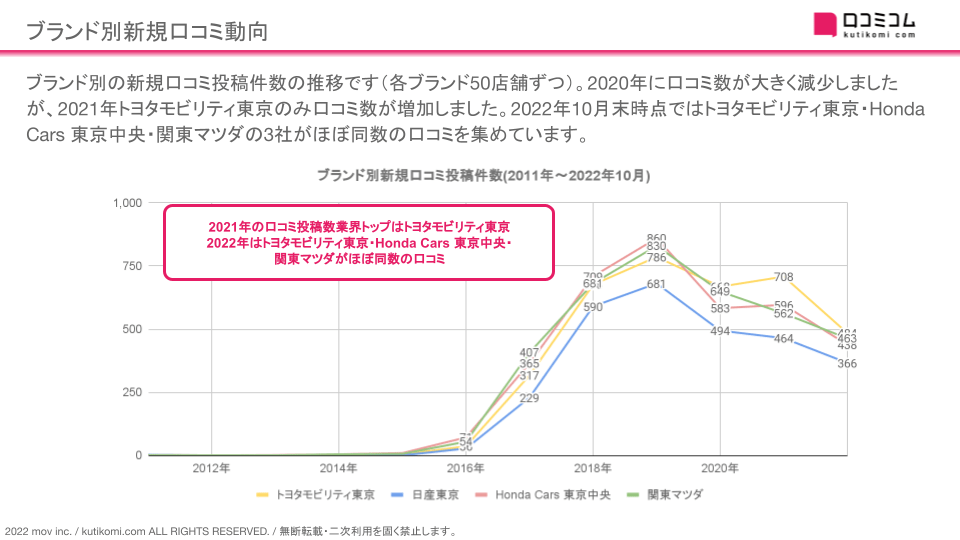 ブランド別の新規口コミ投稿件数の推移です(各ブランド50店舗ずつ)。2020年に口コミ数が大きく減少しましたが、2021年トヨタモビリティ東京のみ口コミ数が増加しました。2022年10月末時点ではトヨタモビリティ東京・Honda Cars 東京中央・関東マツダの3社がほぼ同数の口コミを集めています。