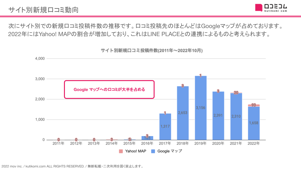 次にサイト別での新規口コミ投稿件数の推移です。口コミ投稿先のほとんどはGoogleマップが占めております。2022年にはYahoo! MAPの割合が増加しており、これはLINE PLACEとの連携によるものと考えられます。