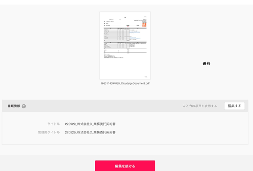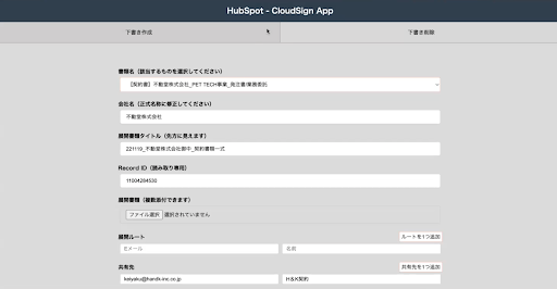 HubSpotの取引フェーズを規定の場所に移動させると、アプリの画面に自動的にHubSpot入力のデータが書き出されます。こちらに展開書類や展開ルートなどを記載し送信すると、クラウドサインに自動で契約書の下書きが発行されます。