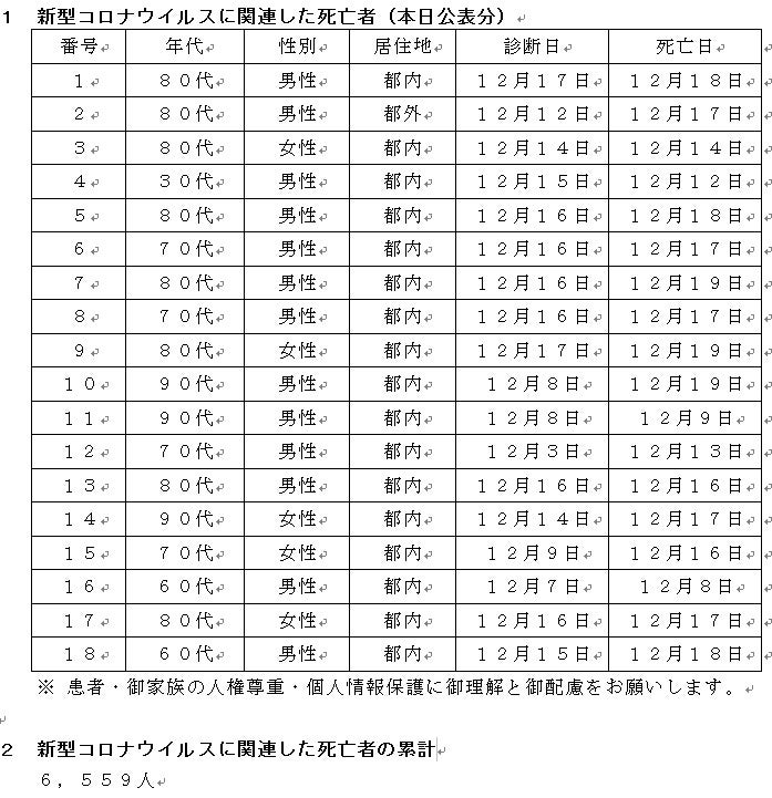 新型コロナウイルスに関連した患者の死亡について business Twitter Facebook はてブ Pocket LINE コピー 2022.12.21 この記事は約1分で読めます。 都内で新型コロナウイルスに感染した方が死亡されましたのでお知らせします。 お亡くなりになった方のご冥福をお祈り申し上げます。