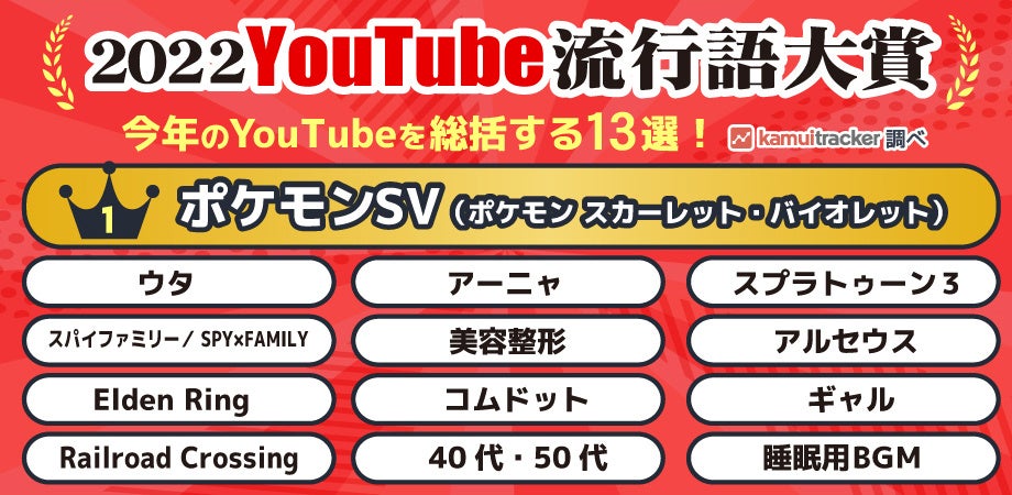 見事、大賞に輝いたのは「ポケモンSV」でした。ゲーム「ポケットモンスター スカーレット・バイオレット」の略称で、2022年11月18日(金)に発売された新作です。発売前から注目されており、初リリース日からまだ1ヶ月ほどしか経っていないにも関わらず、YouTubeでの関連動画の投稿本数は2.2万本を超えています(2022年12月13日時点kamui tracker調べ)。