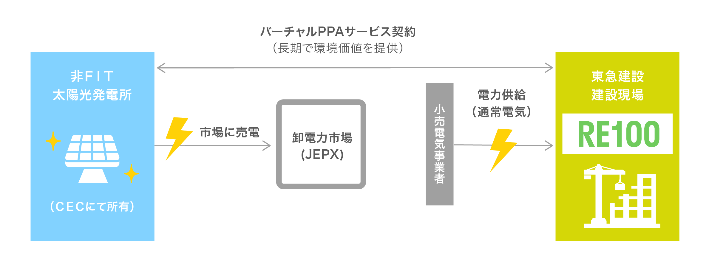 今回手始めとして、東急建設の建設現場向けにクリーンエナジーコネクトが、2023年3月までに日本国内で計4MW-DC(45カ所)の東急建設専用のNon-FIT低圧太陽光発電所を開発し、発電した電力を卸電力取引市場へ売却、電力の環境価値についてクリーンエナジーコネクトから東急建設へ長期(20年間)にわたって提供するバーチャルPPAサービスのスキームを活用します。バーチャルPPAサービスのスキームを活用した建設現場への再生可能エネルギー導入としては、国内の建設業界で初めての取り組みとなります。
